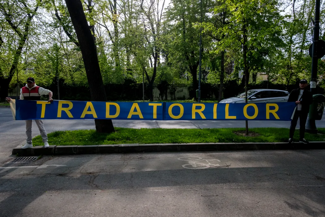 Cateva persoane protesteaza in fata Partidului Social Democrat. Acestia sunt nemultumiti de decizia PSD-ului de a iesi de la guvernare. Bucuresti, 20 aprilie 2026. ALEXANDRU NECHEZ / MEDIAFAX FOTO
