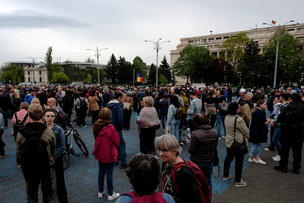 Cateva sute de persoane participa la o manifestatie de sustinere pentru Ilie Bolojan, eveniment desfasurat in Piata Victoriei din Bucuresti, luni, 20 aprilie 2026. ALEXANDRU NECHEZ / MEDIAFAX FOTO