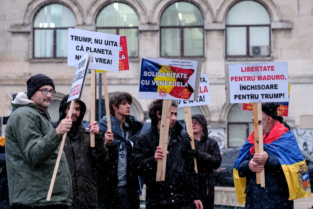 Aproximativ 20 de oameni, membri ai Partidului Socialist Roman, protesteaza pentru sustinerea Venezuelei dupa rapirea presedintelui Nicolas Maduro de catre SUA, in Piata Universitatii, 8 ianuarie 2026. ALEXANDRU NECHEZ / MEDIAFAX FOTO