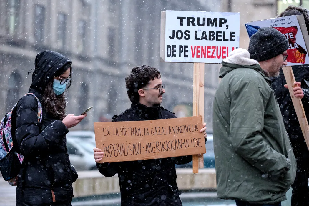 Aproximativ 20 de oameni, membri ai Partidului Socialist Roman, protesteaza pentru sustinerea Venezuelei dupa rapirea presedintelui Nicolas Maduro de catre SUA, in Piata Universitatii, 8 ianuarie 2026. ALEXANDRU NECHEZ / MEDIAFAX FOTO