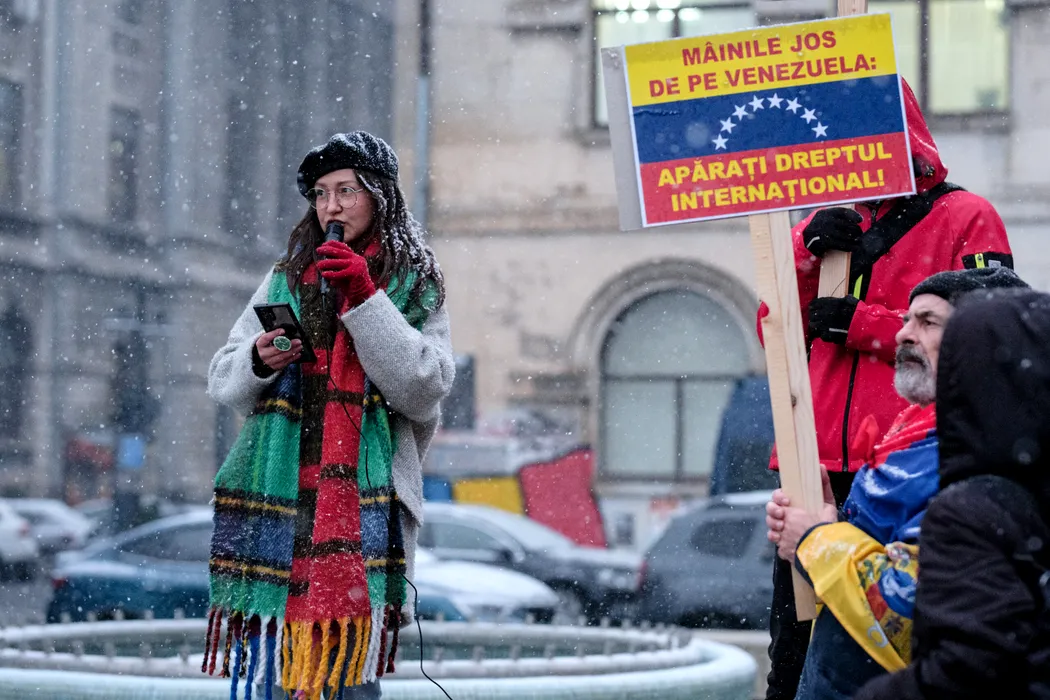 Oana Lasconi, membra a Partidului Socialist Roman si fiica Elenei Lasconi, protesteaza pentru sustinerea Venezuelei dupa rapirea presedintelui Nicolas Maduro de catre SUA, in Piata Universitatii, 8 ianuarie 2026. ALEXANDRU NECHEZ / MEDIAFAX FOTO