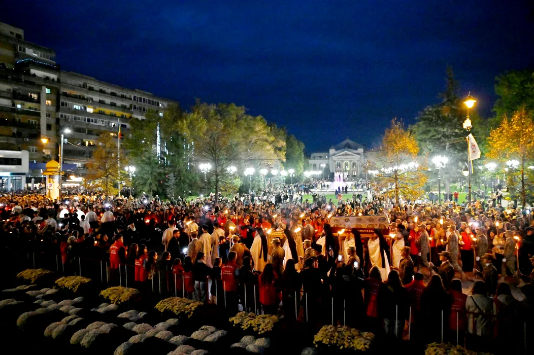 Moastele Sfintei Cuvioase Parascheva si moastele Sfantului Grigorie Palama sunt purtate in cadrul procesiunii "Calea Sfintilor", la Iasi, duminica, 12 octombrie 2025. Sfanta Cuvioasa Parascheva este considerata a fi ocrotitoarea Moldovei, iar ziua de 14 octombrie, cand este hramul, transforma Iasiul in cel mai mare centru de pelerinaj din Romania. DRAGOS PASCANEANU / MEDIAFAX FOTO