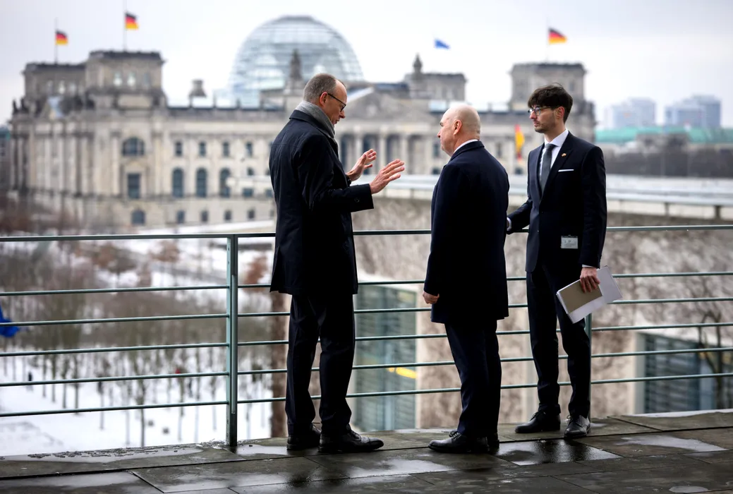 28 January 2026, Berlin: German Chancellor Friedrich Merz shows Ilie Bolojan, Prime Minister of Romania, the Reichstag building from a terrace at the Federal Chancellery in Berlin. Photo: Bernd von Jutrczenka/dpa