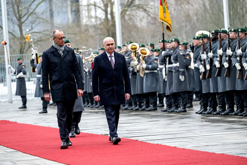 28 January 2026, Berlin: German Chancellor Friedrich Merz (L) welcomes Ilie Bolojan, Prime Minister of Romania, with military honors in front of the Federal Chancellery in Berlin. Photo: Fabian Sommer/dpa