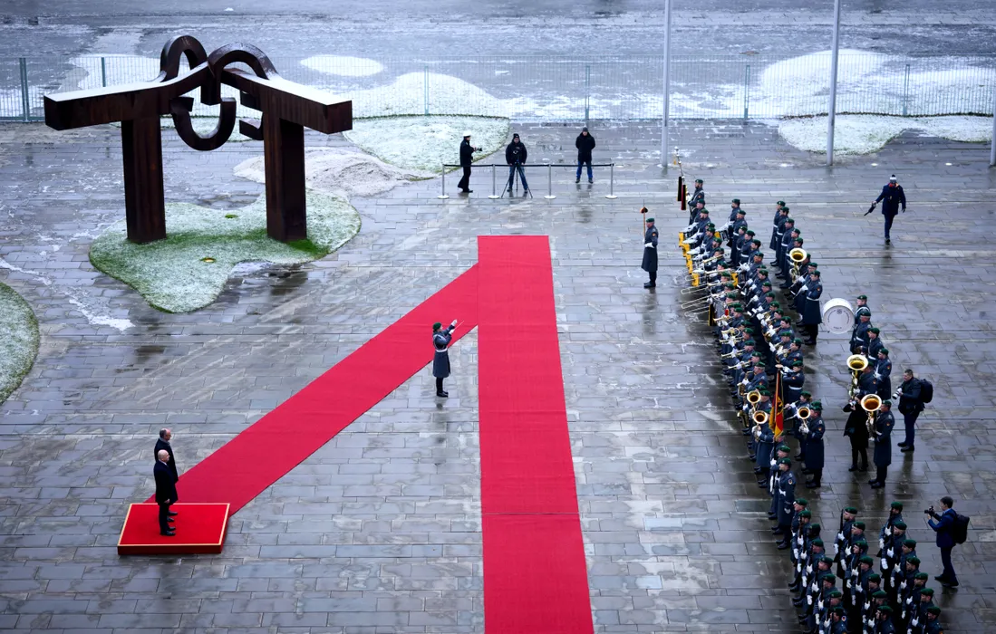 28 January 2026, Berlin: German Chancellor Friedrich Merz welcomes Ilie Bolojan, Prime Minister of Romania, with military honors in front of the Federal Chancellery in Berlin. Photo: Bernd von Jutrczenka/dpa