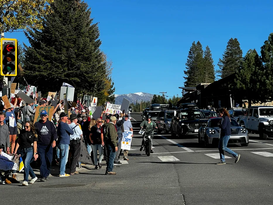 18 October 2025, US, Truckee: Protesters take part in a 'No Kings' protest in Truckee against US President Donald Trump's policies, as part of nationwide 'No Kings' demonstrations. Photo: Barbara Munker/dpa