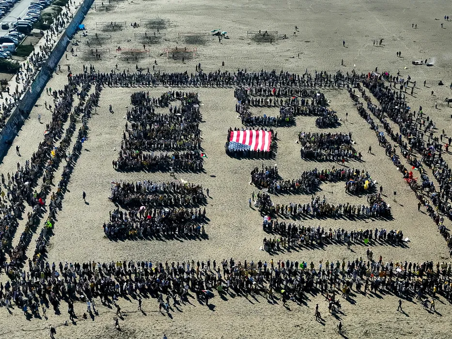 18 October 2025, US, San Francisco: An aerial view shows protesters forming a human banner during a 'No Kings' protest in San Francisco against US President Donald Trump's policies, as part of nationwide 'No Kings' demonstrations. Photo: Paul Kuroda/ZUMA Press Wire/dpa