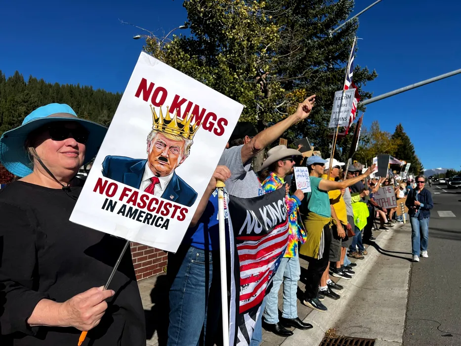 18 October 2025, US, Truckee: Protesters take part in a 'No Kings' protest in Truckee against US President Donald Trump's policies, as part of nationwide 'No Kings' demonstrations. Photo: Barbara Munker/dpa