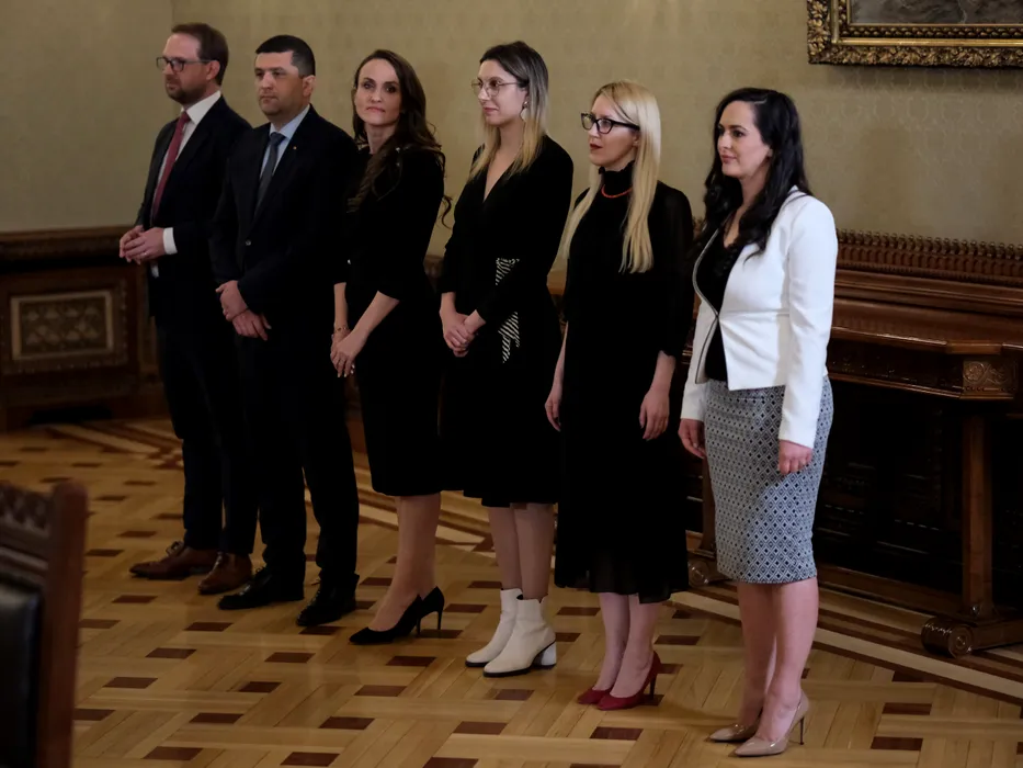 Membrii delegatiei USR, (de la stanga) condusa de presedintele partidului, Dominic Fritz, alaturi de ministrul Apararii, Radu Miruta, ministrul Afacerilor Externe, Oana Toiu, ministrul Mediului, Diana Buzoianu,lidera deputatilor USR, Diana Stoica, si secretarul Camerei Deputatilor, Oana Murariu, participa la consultarile oficiale de la Palatul Cotroceni, miercuri, 22 aprilie 2026. ALEXANDRU NECHEZ / MEDIAFAX FOTO