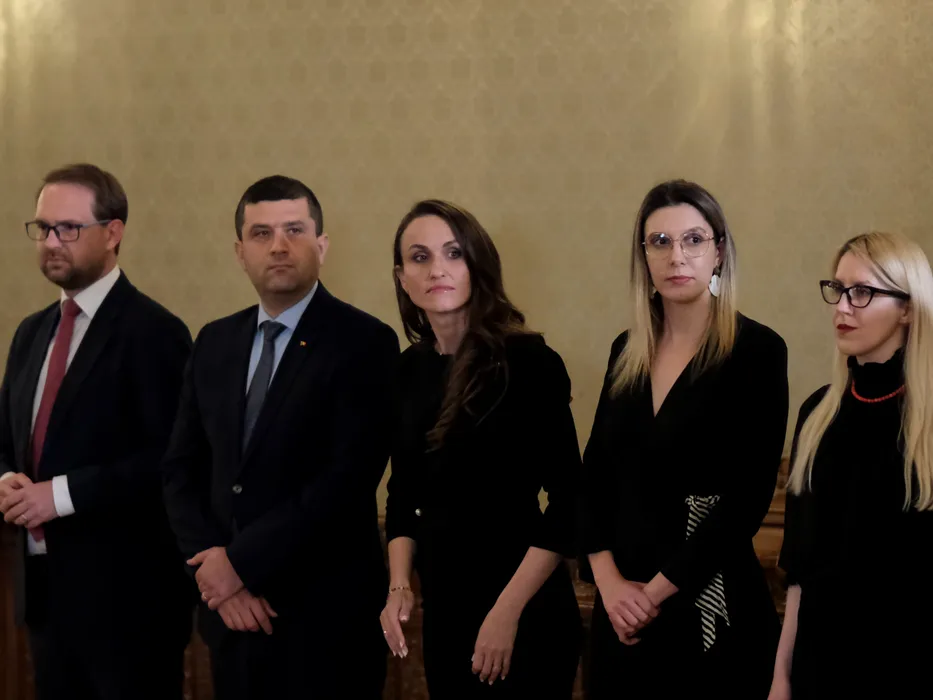 Membrii delegatiei USR, (de la stanga) condusa de presedintele partidului, Dominic Fritz, alaturi de ministrul Apararii, Radu Miruta, ministrul Afacerilor Externe, Oana Toiu, ministrul Mediului, Diana Buzoianu,lidera deputatilor USR, Diana Stoica participa la consultarile oficiale de la Palatul Cotroceni, miercuri, 22 aprilie 2026. ALEXANDRU NECHEZ / MEDIAFAX FOTO