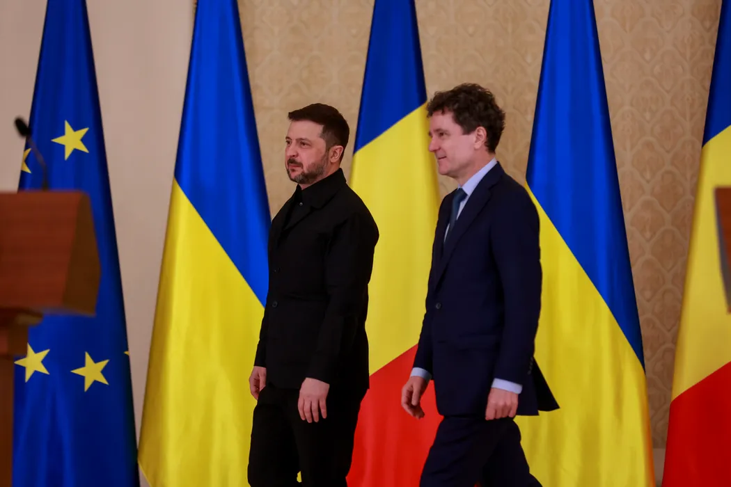 Declaratii de presa comune sustinute de presedintele Ucrainei, Volodimir Zelenski (S), si de presedintele Romaniei, Nicusor Dan (D), la Palatul Cotroceni, in Bucuresti, joi, 12 martie 2026. MIHAI POP / GMN / MEDIAFAX FOTO