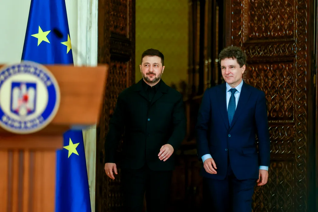 Declaratii de presa comune sustinute de presedintele Ucrainei, Volodimir Zelenski (S), si de presedintele Romaniei, Nicusor Dan (D), la Palatul Cotroceni, in Bucuresti, joi, 12 martie 2026. MIHAI POP / GMN / MEDIAFAX FOTO