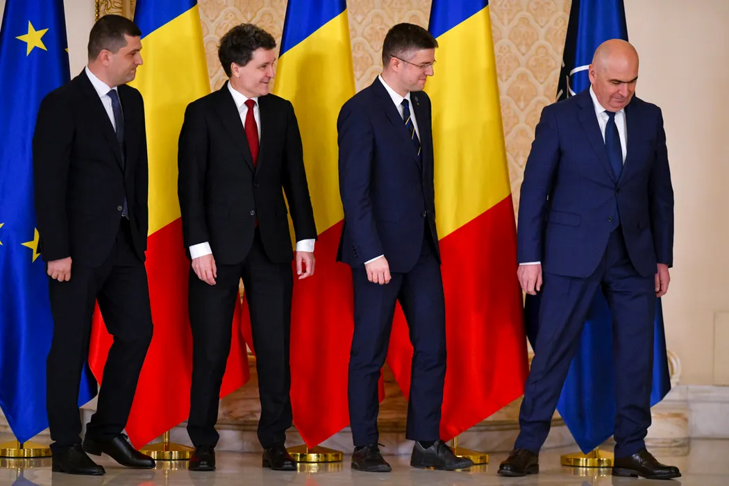 Radu Miruta (S), ministrul Apararii Nationale si vicepremier, si Irineu Darau (CD), ministrul Economiei, Digitalizarii, Antreprenoriatului si Turismului, pozeaza dupa ce au depus juramantul de investitura in functie, alaturi de presedintele Nicusor Dan (CS) si premierul Ilie Bolojan (D), in cadrul unei ceremonii desfasurate la Palatul Cotroceni, marti, 23 decembrie 2025. ALEXANDRU DOBRE / MEDIAFAX FOTO