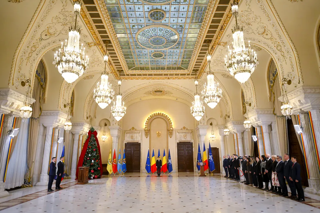 Radu Miruta, ministrul Apararii Nationale si vicepremier, si Irineu Darau, ministrul Economiei, Digitalizarii, Antreprenoriatului si Turismului, depun juramantul de investitura in functie, in prezenta presedintelui Nicusor Dan (C), in cadrul unei ceremonii desfasurate la Palatul Cotroceni, marti, 23 decembrie 2025. ALEXANDRU DOBRE / MEDIAFAX FOTO