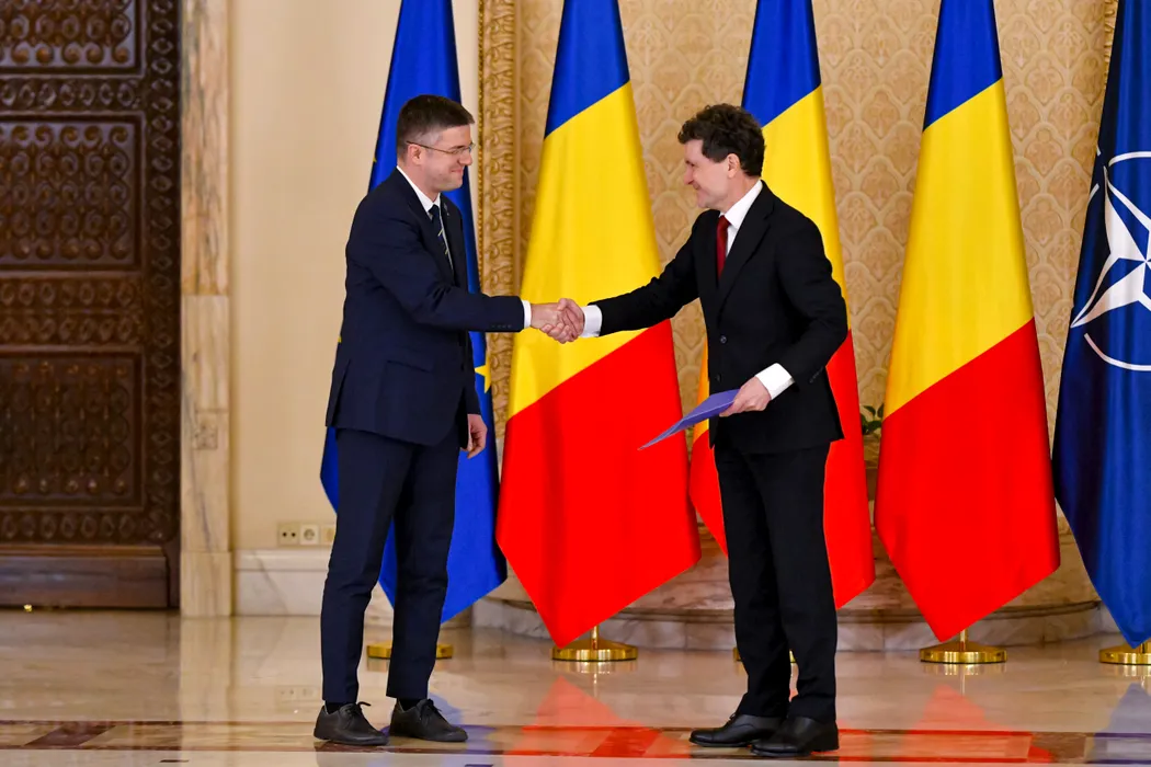 Irineu Darau (S), ministrul Economiei, Digitalizarii, Antreprenoriatului si Turismului, depune juramantul de investitura in functie, in prezenta presedintelui Nicusor Dan (D), in cadrul unei ceremonii desfasurate la Palatul Cotroceni, marti, 23 decembrie 2025. ALEXANDRU DOBRE / MEDIAFAX FOTO