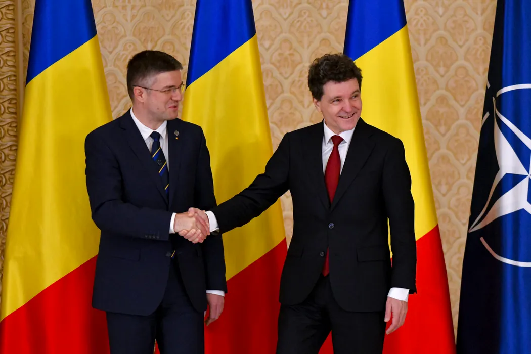 Irineu Darau (S), ministrul Economiei, Digitalizarii, Antreprenoriatului si Turismului, depune juramantul de investitura in functie, in prezenta presedintelui Nicusor Dan (D), in cadrul unei ceremonii desfasurate la Palatul Cotroceni, marti, 23 decembrie 2025. ALEXANDRU DOBRE / MEDIAFAX FOTO