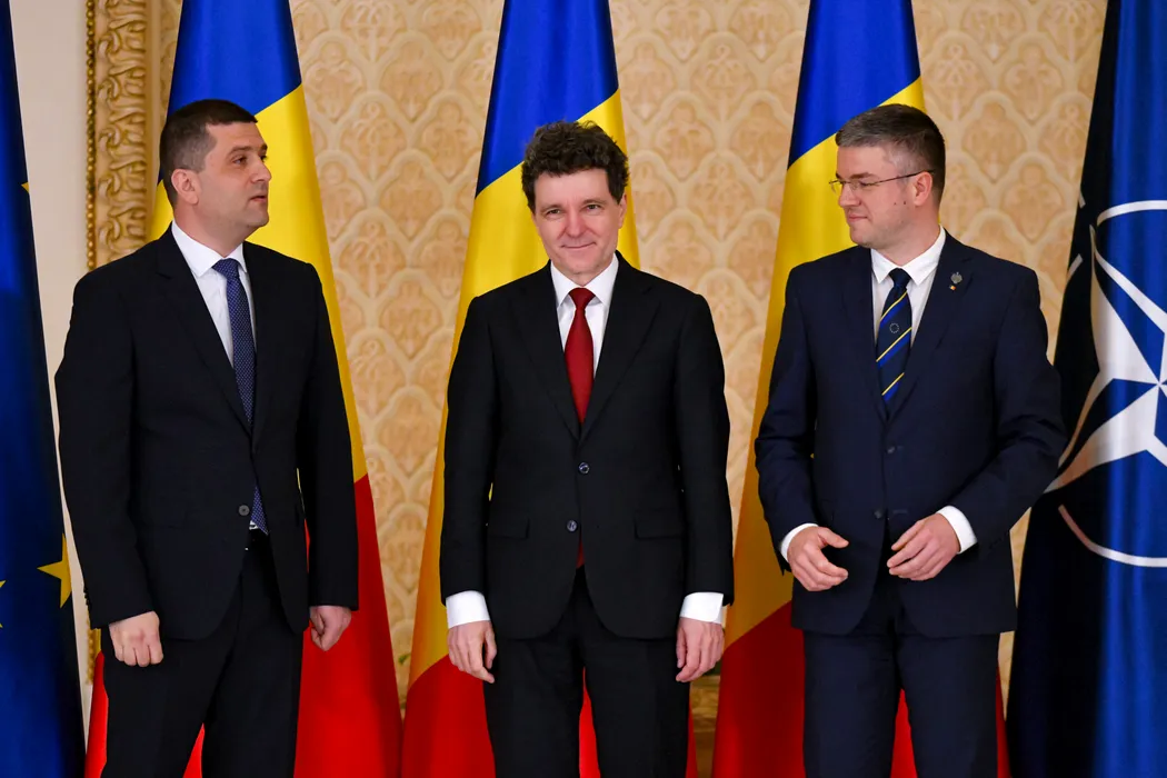 Radu Miruta (S), ministrul Apararii Nationale si vicepremier, si Irineu Darau (D), ministrul Economiei, Digitalizarii, Antreprenoriatului si Turismului, au depus juramantul de investitura in functie, in prezenta presedintelui Nicusor Dan (C), in cadrul unei ceremonii desfasurate la Palatul Cotroceni, marti, 23 decembrie 2025. ALEXANDRU DOBRE / MEDIAFAX FOTO
