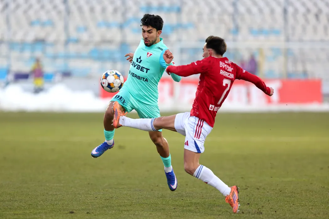Meciul de fotbal dintre Otelul Galati (echipament alb/rosu) si UTA Arad (echipament verde), din etapa a XXVIII-a a Superligii, disputat pe stadion Otelul din Galati, vineri, 20 februarie 2026. SORIN PANA / MEDIAFAX FOTO