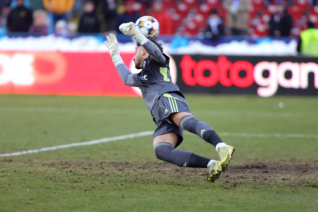 Meciul de fotbal dintre Otelul Galati (echipament alb/rosu) si UTA Arad (echipament verde), din etapa a XXVIII-a a Superligii, disputat pe stadion Otelul din Galati, vineri, 20 februarie 2026. SORIN PANA / MEDIAFAX FOTO