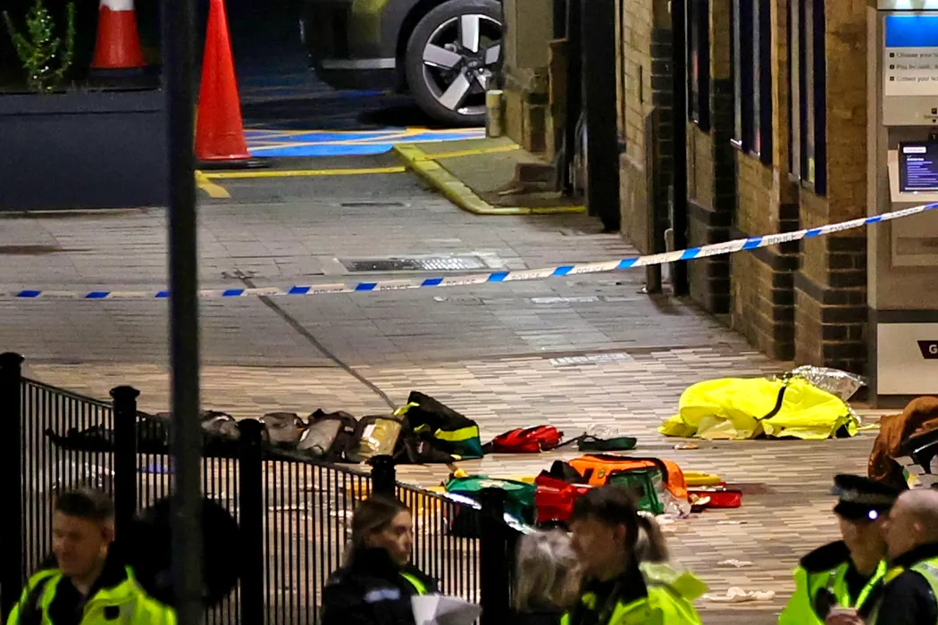 01 November 2025, United Kingdom, Huntingdon: Discarded emergency equipment lies on the ground after an incident at Huntingdon train station in Cambridgeshire, where several people were stabbed on a train. Two people have been arrested after British Transport Police responded to the incident. Photo: Chris Radburn/PA Wire/dpa