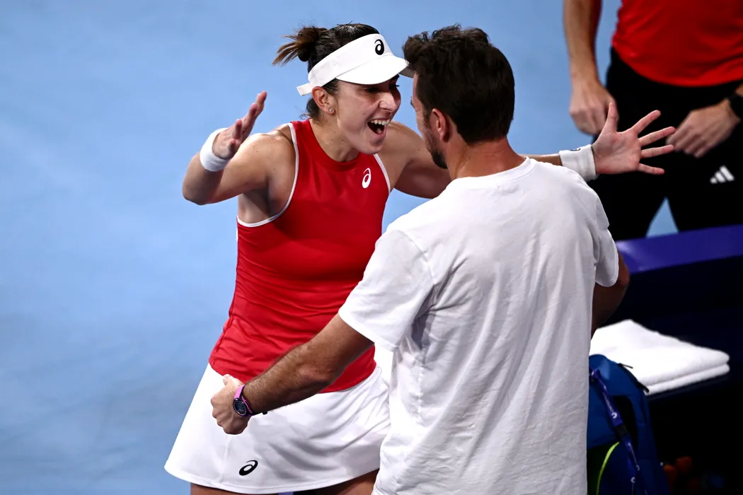 11 January 2026, Australia, Sydney: Swiss tennis player Belinda Bencic celebrates with team captain Stan Wawrinka after winning her women's singles final match against Iga Swiatek at the 2026 United Cup at Ken Rosewall Arena. Photo: Dan Himbrechts/AAP/dpa