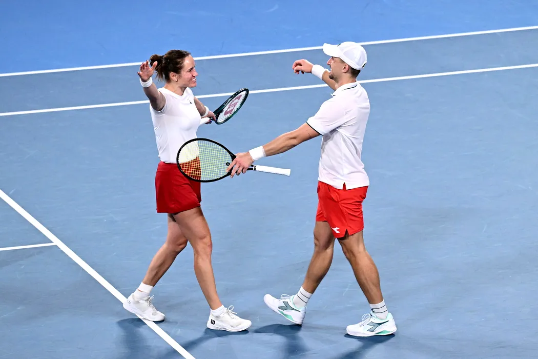 11 January 2026, Australia, Sydney: Poland's Katarzyna Kawa and Jan Zielinski celebrate defeating Belinda Bencic and Jakub Paul of Switzerland in their mixed doubles final match of the 2026 United Cup at Ken Rosewall Arena in Sydney. Photo: Dan Himbrechts/AAP/dpa