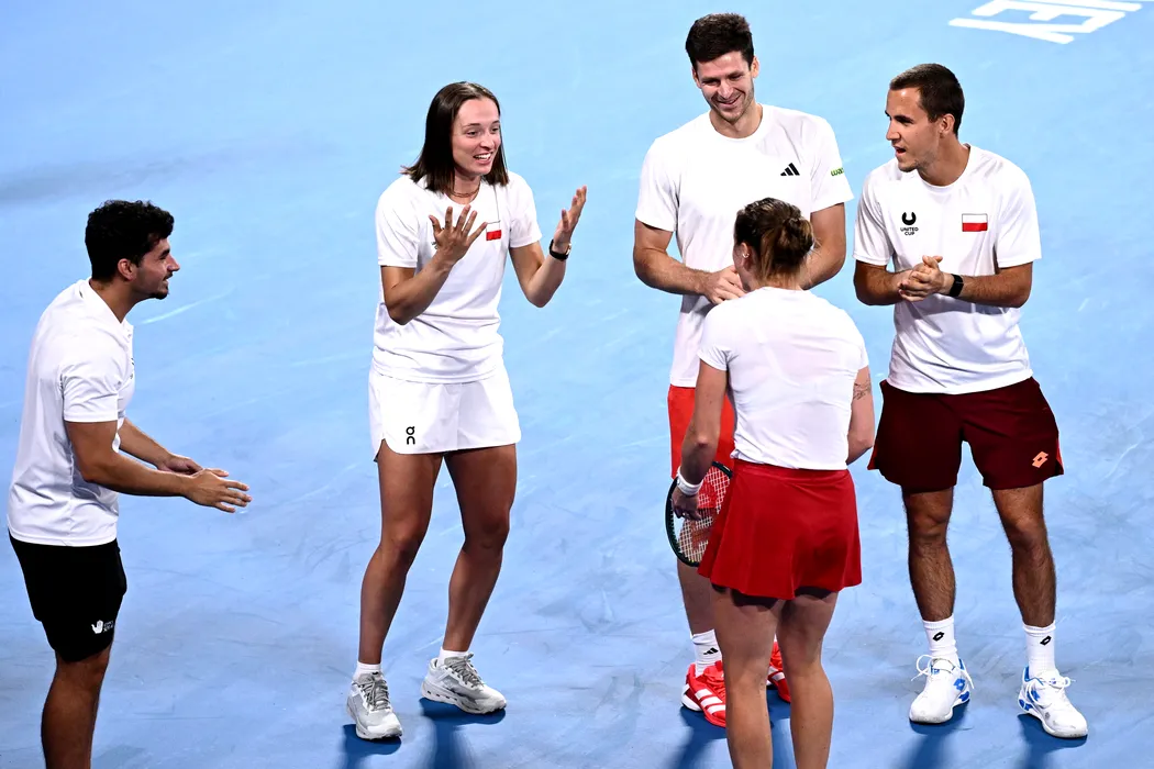 11 January 2026, Australia, Sydney: Poland's Iga Swiatek and Hubert Hurkacz celebrate with Katarzyna Kawa and Jan Zielinski after winning the mixed doubles final match against Belinda Bencic and Jakub Paul of Switzerland at the 2026 United Cup at Ken Rosewall Arena in Sydney. Photo: Dan Himbrechts/AAP/dpa