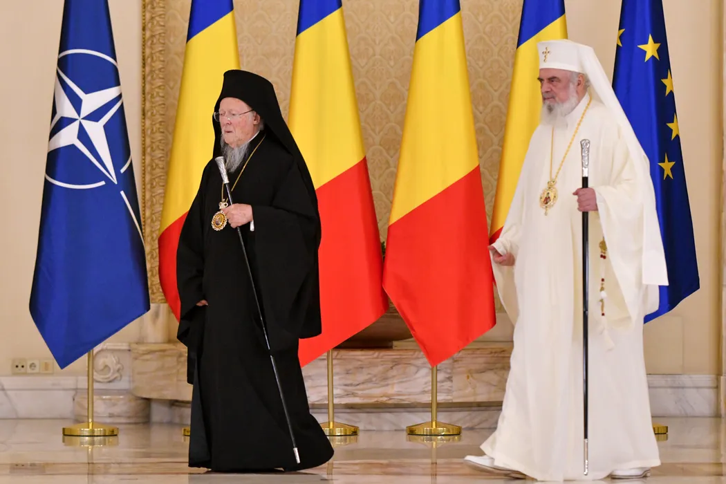 Sanctitatea Sa Bartolomeu I (S), Patriarhul Ecumenic al Constantinopolului, si Preafericitul Parinte Daniel (D), Patriarhul Bisericii Ortodoxe Romane, participa la o ceremonie de decorare, la Palatul Cotroceni din Bucuresti, luni, 27 octombrie 2025. ALEXANDRU DOBRE / MEDIAFAX FOTO