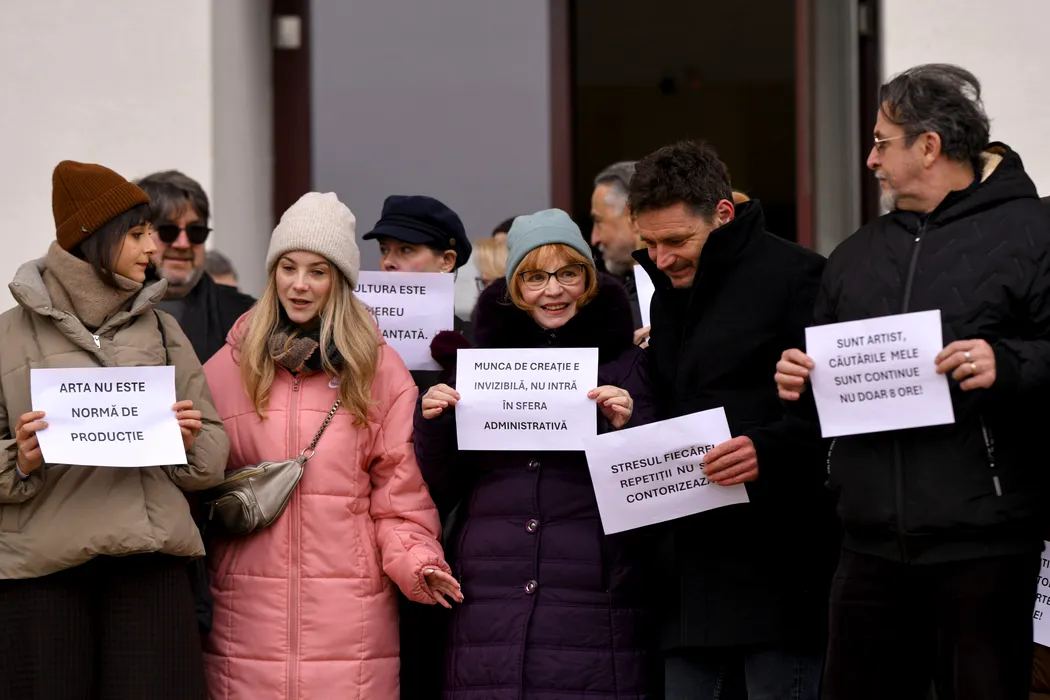 Actorii Teatrului National „I.L. Caragiale” protesteaza, in fata institutiei, fata de aplicarea unui proiect-pilot transmis de Ministerul Culturii privind organizarea unitara si evidenta timpului de munca, in Bucuresti, marti 10 februarie 2026. ALEXANDRU DOBRE / MEDIAFAX FOTO