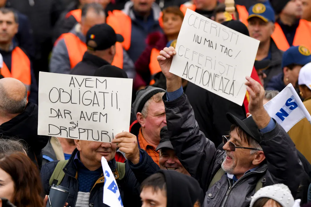 Persoane afiseaza pancarte in timpul unui protest impotriva masurilor de austeritate, organizat de BNS (Blocul National Sindical), in Piata Victoriei din Bucuresti, miercuri, 12 noiembrie 2025. ALEXANDRU DOBRE / MEDIAFAX FOTO.