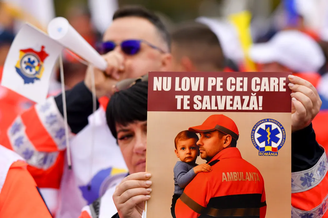 Persoane afiseaza pancarte in timpul unui protest impotriva masurilor de austeritate, organizat de BNS (Blocul National Sindical), in Piata Victoriei din Bucuresti, miercuri, 12 noiembrie 2025. ALEXANDRU DOBRE / MEDIAFAX FOTO.