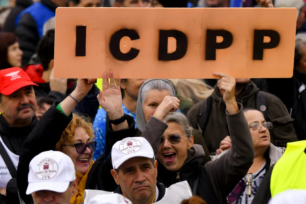 Persoane afiseaza pancarte in timpul unui protest impotriva masurilor de austeritate, organizat de BNS (Blocul National Sindical), in Piata Victoriei din Bucuresti, miercuri, 12 noiembrie 2025. ALEXANDRU DOBRE / MEDIAFAX FOTO.