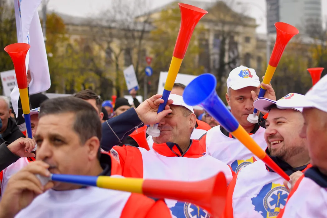 Persoane sufla in vuvuzele in timpul unui protest impotriva masurilor de austeritate, organizat de BNS (Blocul National Sindical), in Piata Victoriei din Bucuresti, miercuri, 12 noiembrie 2025. ALEXANDRU DOBRE / MEDIAFAX FOTO.