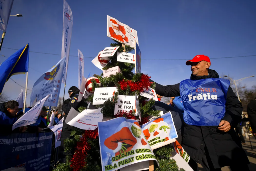 Sindicalisti din patru confederatii ies in strada la Palatul Cotroceni, solicitand Presedintiei implicarea intr-o mediere intre Guvern si partenerii sociali, pe fondul tensiunilor generate de masurile de austeritate si nivelul salariului minim pe economie, in Bucuresti, joi, 18 decembrie 2025. ALEXANDRU DOBRE / MEDIAFAX FOTO
