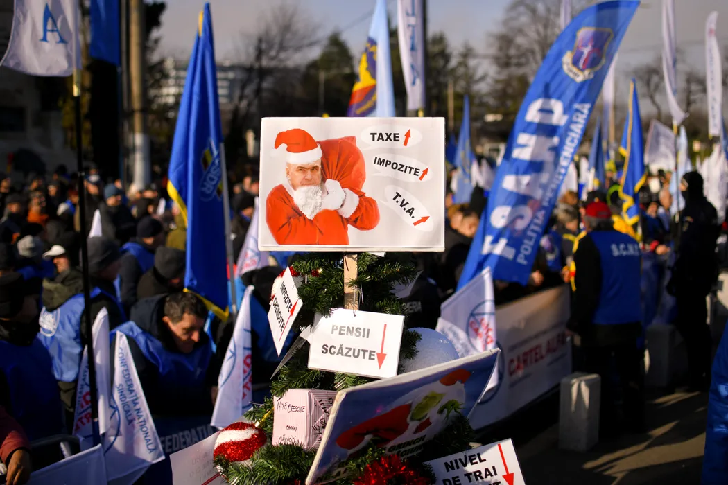 Sindicalisti din patru confederatii ies in strada la Palatul Cotroceni, solicitand Presedintiei implicarea intr-o mediere intre Guvern si partenerii sociali, pe fondul tensiunilor generate de masurile de austeritate si nivelul salariului minim pe economie, in Bucuresti, joi, 18 decembrie 2025. ALEXANDRU DOBRE / MEDIAFAX FOTO