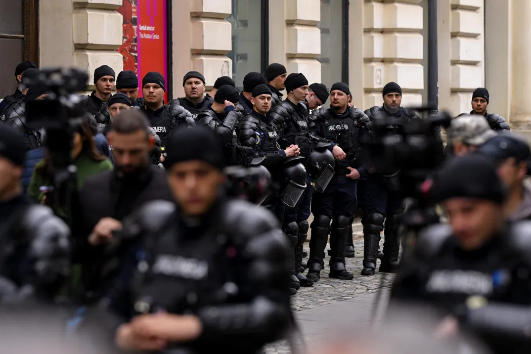 Forte de ordine sunt prezente in timpul unui protest organizat de Alianta pentru Unirea Romanilor in fata Autoritatii Electorale Permanente (AEP), miercuri, 26 martie 2025. ALEXANDRU DOBRE / MEDIAFAX FOTO