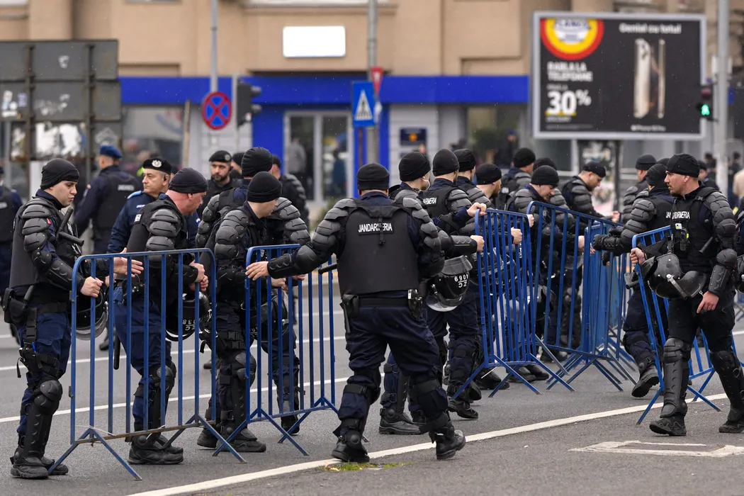 Jandarmi monteaza garduri mobile in Piata Victoriei in timpul unui protest organizat de Alianta pentru Unirea Romanilor in Bucuresti, miercuri, 26 martie 2025. ALEXANDRU DOBRE / MEDIAFAX FOTO