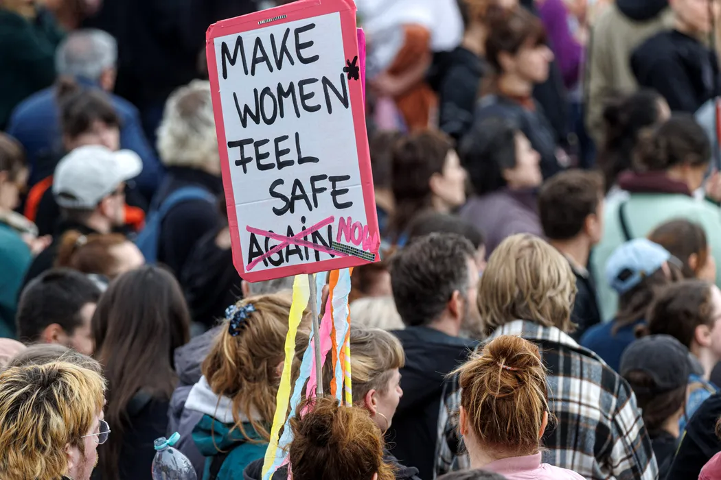 08 March 2026, Hamburg: A woman holds a sign reading "Make Women Feel Safe Now!" during a march on International Women's Day in Hamburg. Photo: Markus Scholz/dpa