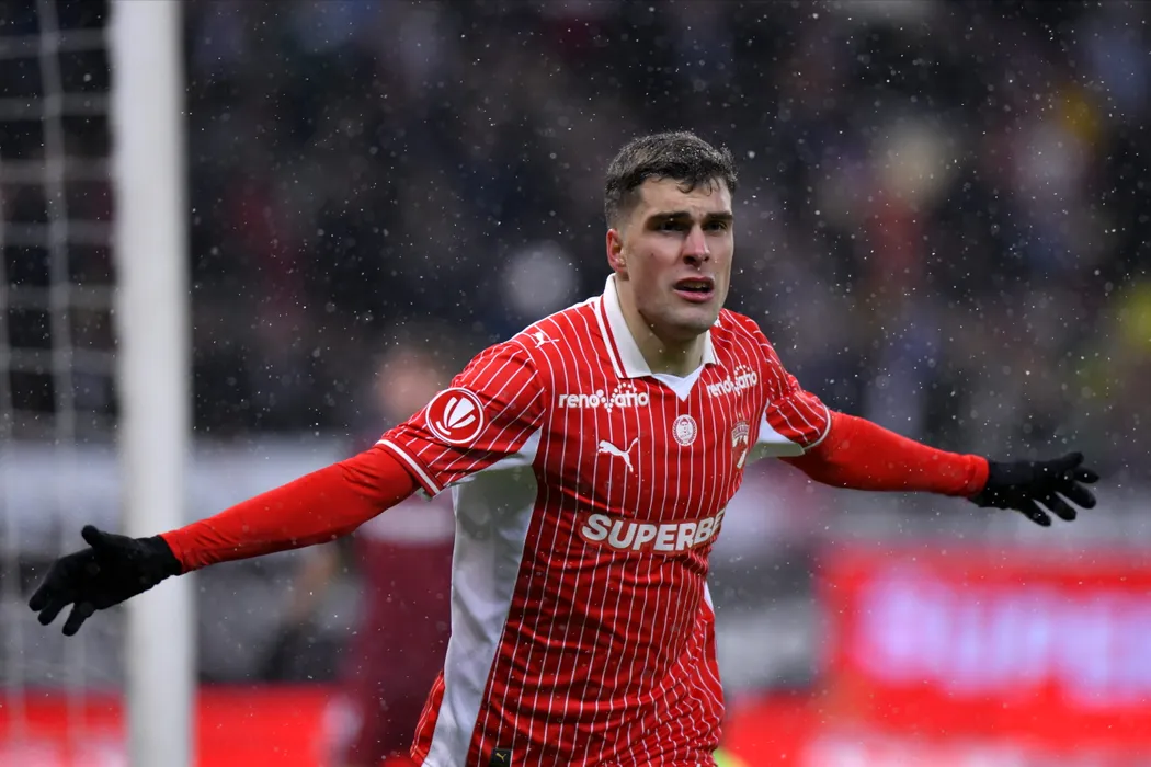 Alberto Soro, de la Dinamo, reactioneaza in timpul meciului de fotbal contra echipei Rapid, din etapa a XXVIII-a a Superligii, disputat pe Arena Nationala din Bucuresti, sambata, 21 februarie 2026. ALEXANDRU DOBRE / MEDIAFAX FOTO