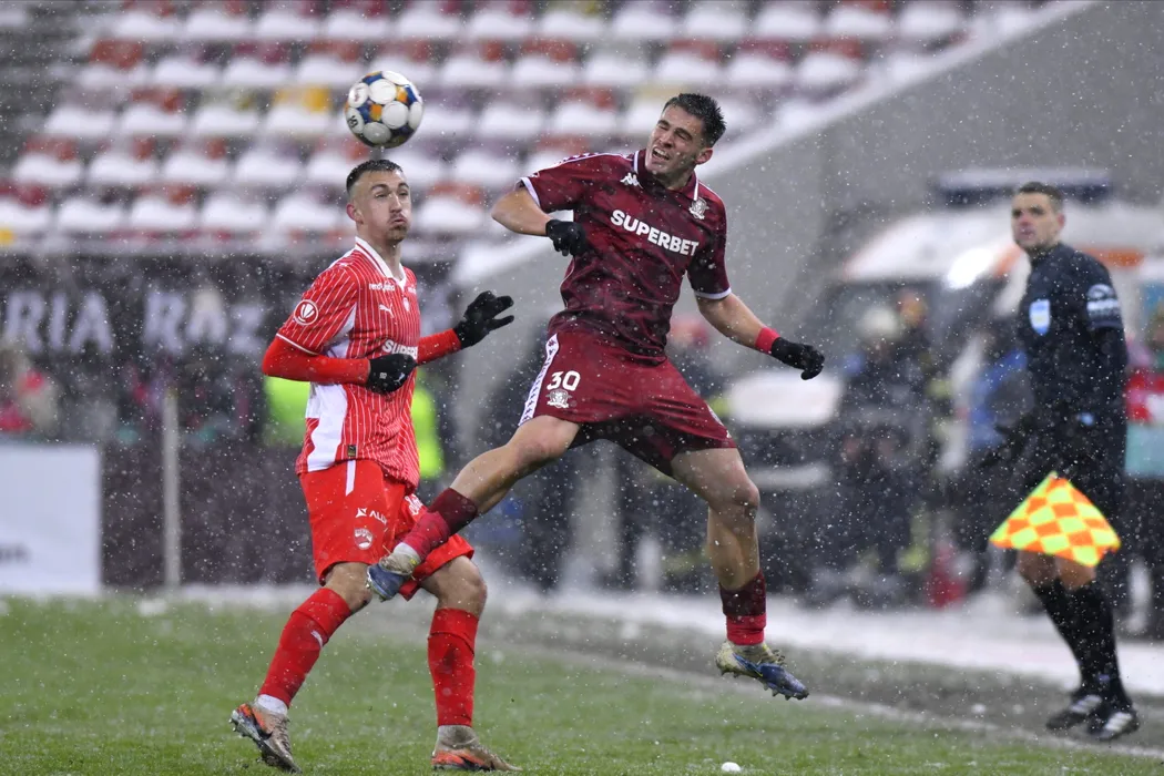 Daniel Paraschiv (D), de la Rapid, lupta pentru balon cu Nikita Stoinov (S), de la Dinamo, in timpul meciului de fotbal din etapa a XXVIII-a a Superligii, disputat pe Arena Nationala din Bucuresti, sambata, 21 februarie 2026. ALEXANDRU DOBRE / MEDIAFAX FOTO