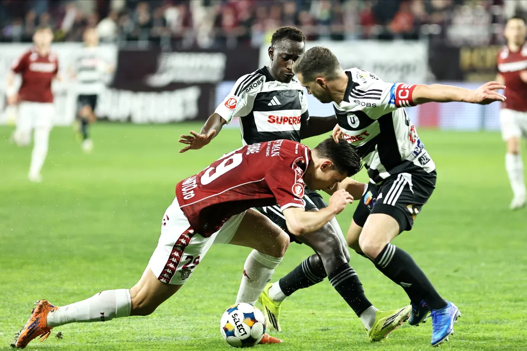 Alexandru Dobre (S), de la Rapid, lupta pentru balon cu Alexandru Chipciu (D), de la Universitatea Cluj, in timpul meciului de fotbal din etapa a III-a a play-off-ului Superligii, disputat pe stadionul Giulesti din Bucuresti, duminica, 5 aprilie 2026. GEORGE FILIP / MEDIAFAX FOTO