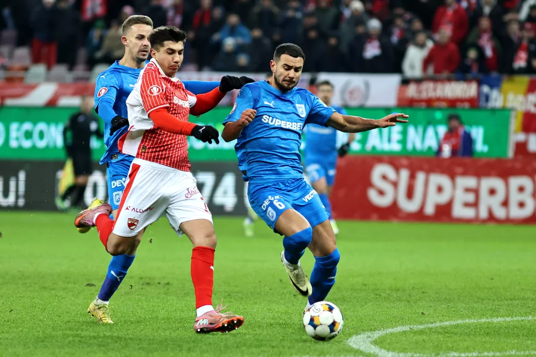 Alexandru Musi (S), de la Dinamo, lupta pentru balon cu Vladimir Screciu (D), de la Universitatea Craiova, in timpul meciului de fotbal din etapa a XXVI-a a Superligii, disputat pe Stadionul Arcul de Triumf din Bucuresti, luni, 9 februarie 2026. GEORGE FLUSTER/ MEDIAFAX FOTO