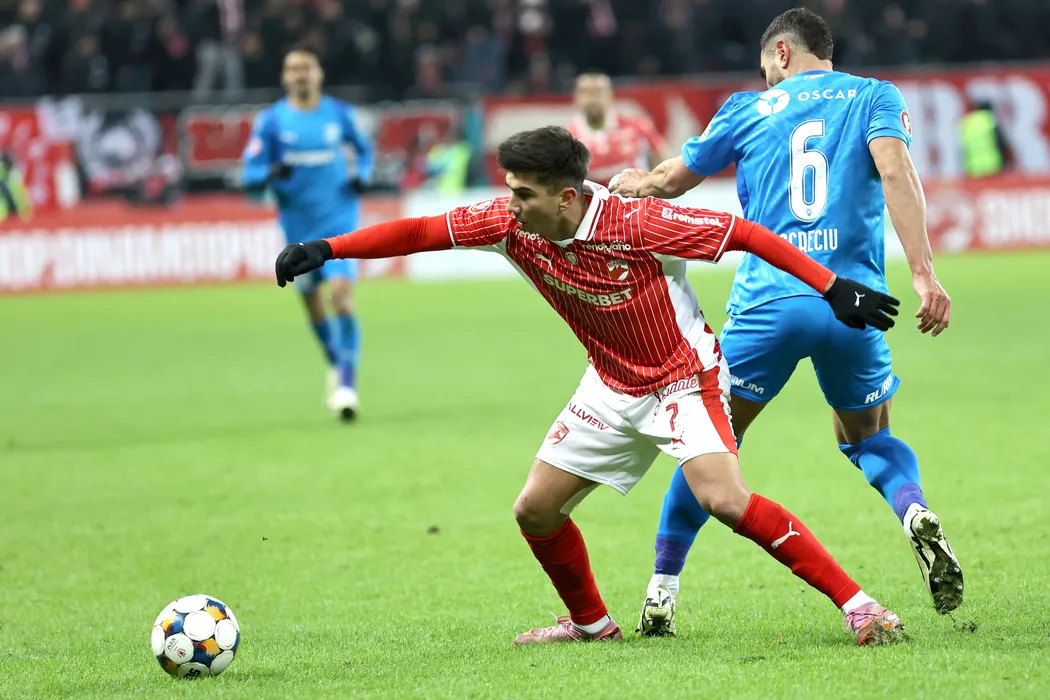 Alexandru Musi (S), de la Dinamo, lupta pentru balon cu Vladimir Screciu (D), de la Universitatea Craiova, in timpul meciului de fotbal din etapa a XXVI-a a Superligii, disputat pe Stadionul Arcul de Triumf din Bucuresti, luni, 9 februarie 2026. GEORGE FLUSTER/ MEDIAFAX FOTO