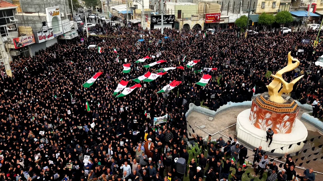 An aerial view of mourners carrying Iranian flags and portraits as they gather during a funeral ceremony for children, who lost their lives after a primary school in Iran’s Hormozgan province was targeted in US and Israeli attacks, on March 03, 2026 in Minab, Iran. Thousands of people, including families and officials, attended the ceremony. Photo by Stringer/Parspix/ABACAPRESS.COM