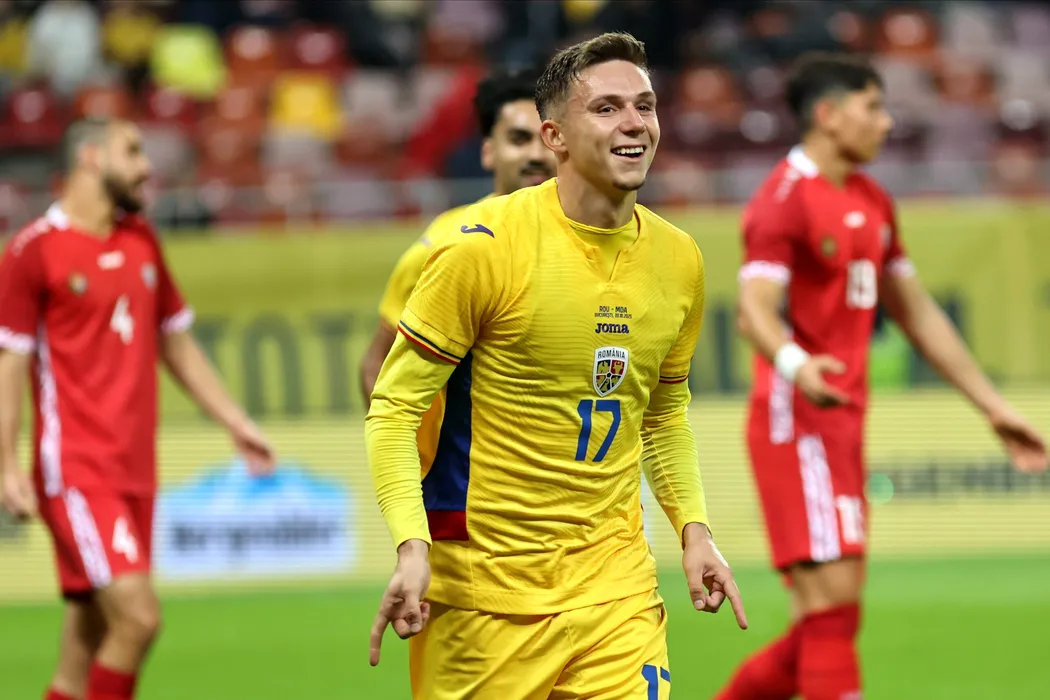 Louis Munteanu (S), de la echipa nationala a Romaniei, reactioneaza dupa ce a inscris un gol in timpul meciului de fotbal contra selectionatei Moldovei, in amicalul de fotbal disputat pe Arena Nationala din Bucuresti, joi, 9 octombrie 2025. GEORGE FLUSTER / MEDIAFAX FOTO