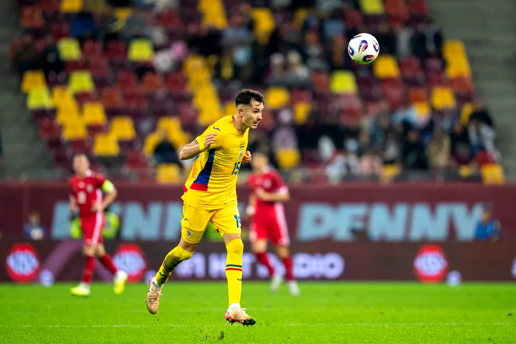 Raul Oprut, de la echipa nationala a Romaniei, suteaza in timpul meciului de fotbal contra selectionatei Moldovei, in amicalul de fotbal disputat pe Arena Nationala din Bucuresti, joi, 9 octombrie 2025. MARC MARASESCU / MEDIAFAX FOTO