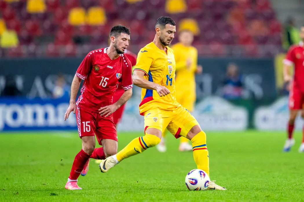 Vladimir Screciu (D), de la echipa nationala a Romaniei, lupta pentru balon cu Ion Bors (S), de la selectionata Moldovei, in amicalul de fotbal disputat pe Arena Nationala din Bucuresti, joi, 9 octombrie 2025MARC MARASESCU / MEDIAFAX FOTO