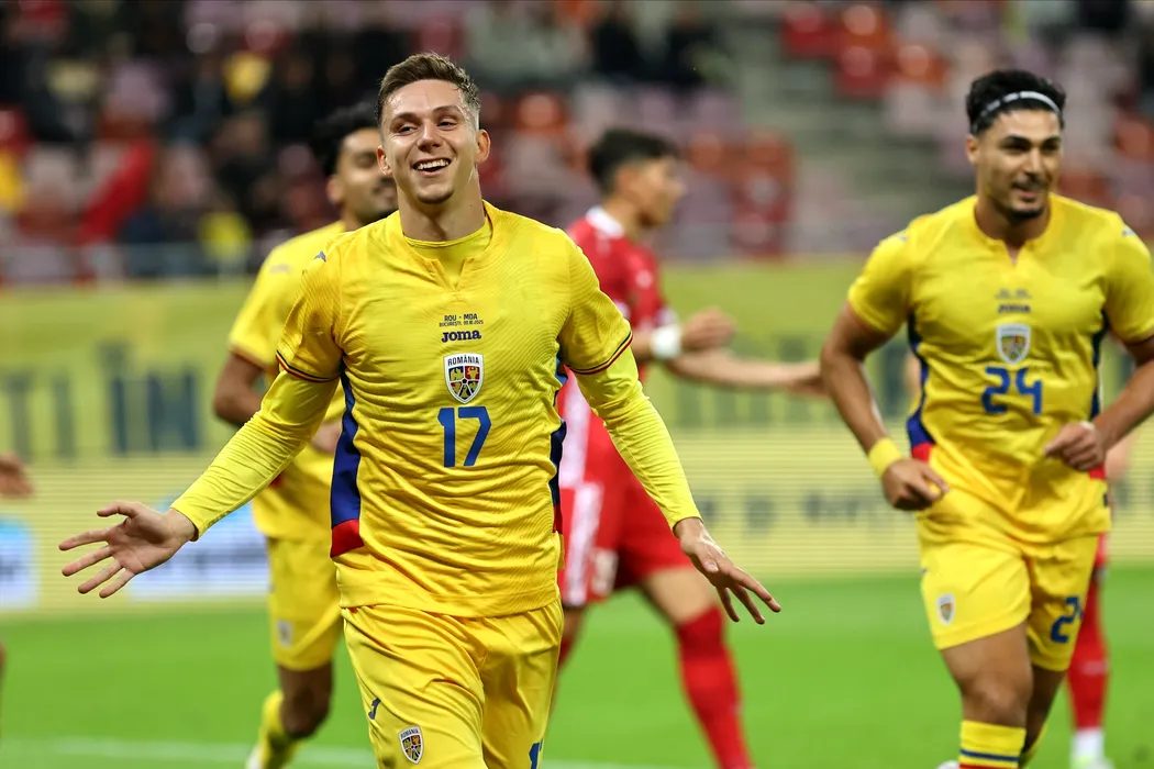 Louis Munteanu (S), de la echipa nationala a Romaniei, reactioneaza dupa ce a inscris un gol in timpul meciului de fotbal contra selectionatei Moldovei, in amicalul de fotbal disputat pe Arena Nationala din Bucuresti, joi, 9 octombrie 2025. GEORGE FLUSTER / MEDIAFAX FOTO