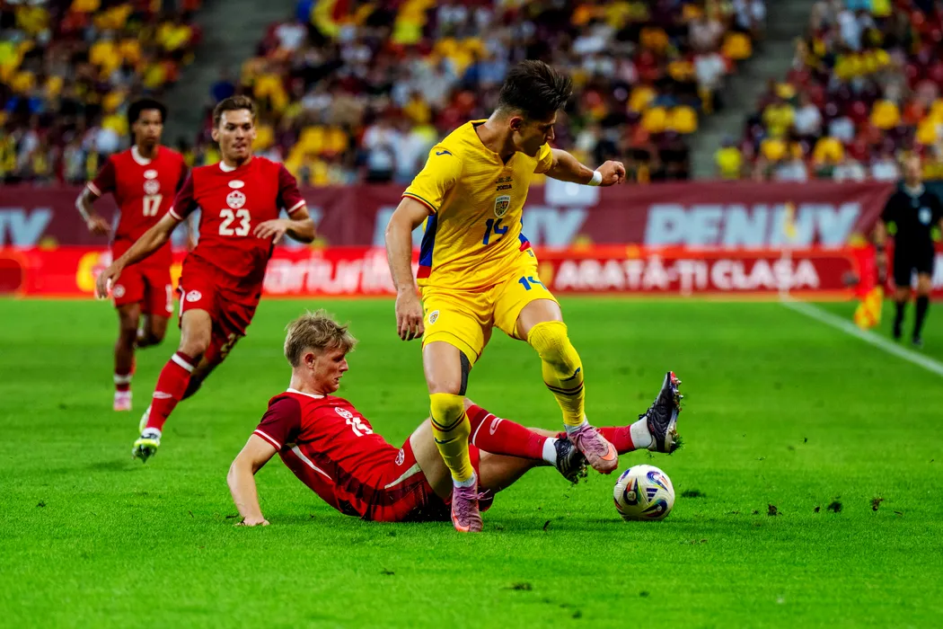 Alexandru Dobre (D), de la echipa nationala a Romaniei, suteaza in timpul meciului de fotbal contra selectionatei Canadei, in amicalul de fotbal disputat pe Arena Nationala din Bucuresti, vineri, 5 septembrie 2025. MARC MARASESCU / MEDIAFAX FOTO
