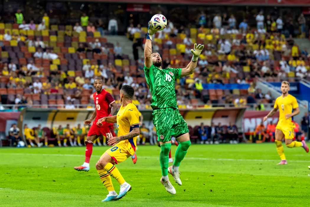 Portarul Maxime Crepeau (S), de la echipa nationala a Canadei, prinde o minge in timpul meciului amical de fotbal contra Romaniei, disputat pe Arena Nationala din Bucuresti, vineri, 5 septembrie 2025. MARC MARASESCU / MEDIAFAX FOTO